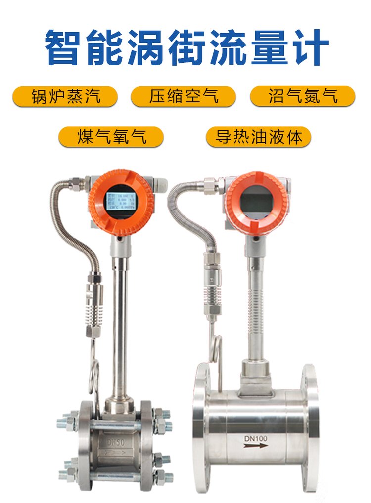/ product introductionHY-LUGB智能渦街流量計主要用于工業(yè)管道介質(zhì)流體的流量測量,如氣體、液體、蒸氣等多種介質(zhì)。其特點是壓力損失小,量程范圍大,精度高,在測量工況體積流量時幾乎不受流體密度、壓力、溫度、粘度等參數(shù)的影響。無可動機械零件,因此可靠性高,維護量小,儀表參數(shù)能長期穩(wěn)定。渦街流量計采用壓電應力式傳感器,可靠性高,可在-20℃~+250℃的工作溫度范圍內(nèi)工作。有模擬標準信號,也有數(shù)字脈沖信號輸出,容易與計算機等數(shù)字系統(tǒng)配套使用,是一種比較先進、理想的流量儀表。HY-LUGB系列渦街流量計是依據(jù)卡門旋渦原理進行封閉管道流體流量測量的流量計。因其具有良好的介質(zhì)適應能力,無需溫度壓力補償即可直接測量蒸汽、空氣、氣體、水、液體的工況體積流量,配備溫度、壓力傳感器可測量標況體積流量和質(zhì)量流量,是節(jié)流式流量計的理想替代產(chǎn)品。