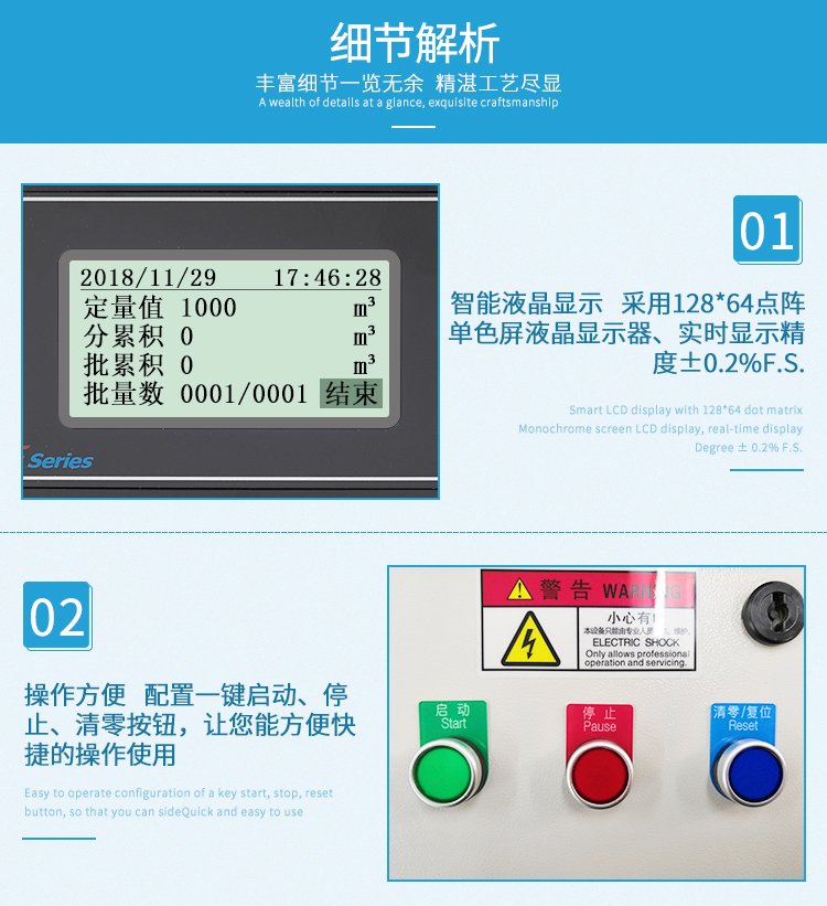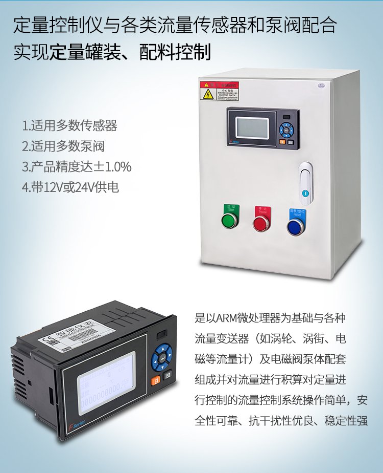 / product introduction定量控制系統(tǒng)具有體積小、重量輕、操作簡(jiǎn)單,顯示讀數(shù)直觀,清晰、可靠性高等明顯優(yōu)點(diǎn),與靶式流量計(jì)、質(zhì)量流量計(jì)、渦輪流量計(jì)、電磁流量計(jì)、渦街流量計(jì)等脈沖輸出的流量傳感器及電磁閥配套組成流量控制系統(tǒng),流量表反饋給定量控制儀的脈沖或電流流量信號(hào),當(dāng)流量累計(jì)流量達(dá)到設(shè)定的數(shù)值(定量值),定量控制儀會(huì)給電磁閥門(mén)或泵一個(gè)開(kāi)關(guān)信號(hào),已達(dá)到對(duì)閥門(mén)、泵的啟動(dòng)和關(guān)閉控制。實(shí)現(xiàn)對(duì)加料的自動(dòng)和手動(dòng)控制。該系統(tǒng)精度高,操作簡(jiǎn)單,可現(xiàn)場(chǎng)校準(zhǔn)。定量控制系統(tǒng)適用于石油、化工、醫(yī)藥、食品等行業(yè)氣體、液體的流量定量(批量)控制。