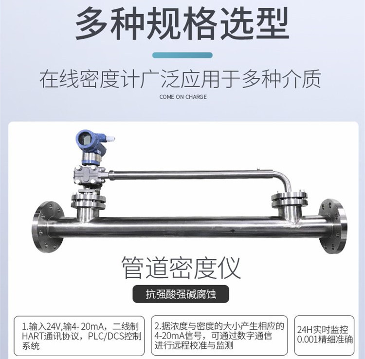 / product introductionHY-3351MD系列智能差壓式密度計(jì)也稱差壓式密度變送器,采用一體化結(jié)構(gòu)的兩線制變送器,是一種用于連續(xù)在線測量液體濃度和密度的設(shè)備,可直接用于工業(yè)生產(chǎn)過程中。智能差壓密度計(jì)采用差壓式密度計(jì)的原理,能根據(jù)介質(zhì)在一定垂直距離上的差壓值算出密度值,并自動(dòng)進(jìn)行補(bǔ)償,精度高,可靠性好,安裝使用簡單。為二線制密度變送器,主要用于工業(yè)過程控制,在線密度計(jì)根據(jù)濃度與密度的大小產(chǎn)生相應(yīng)的4-20mA信號(hào),可通過數(shù)字通信進(jìn)行遠(yuǎn)程校準(zhǔn)與監(jiān)測。智能差壓式密度計(jì)被廣泛應(yīng)用于食品,石油化工等行業(yè)。